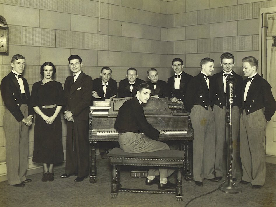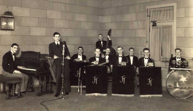 Here we are ready to play in the WADC studio back in 1935. Yes, that's yours truly behind the drums.