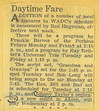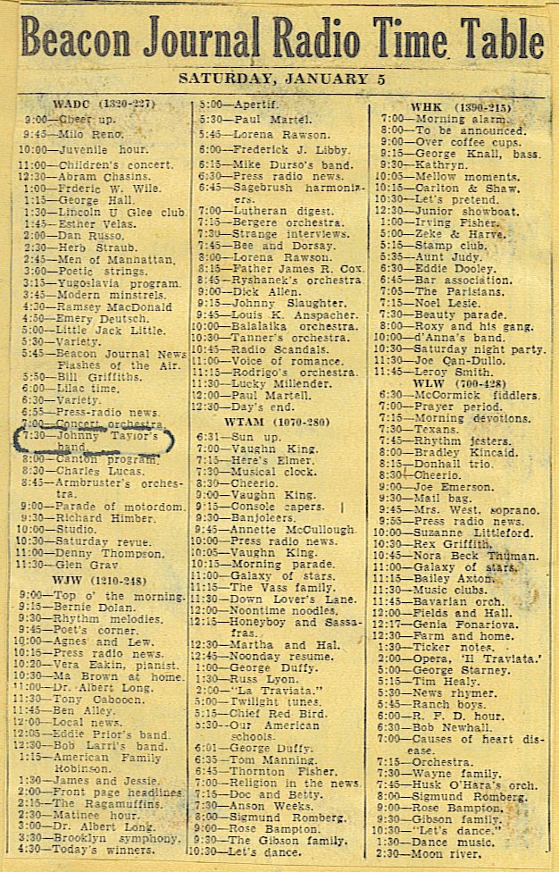 The Johnny Taylor Orchestra played live music on two Akron radio stations, WADC and WFJC.
